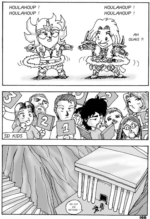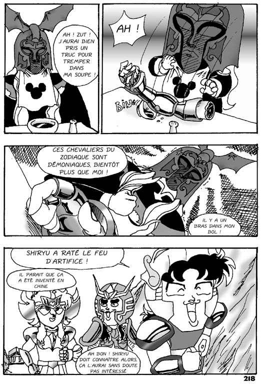Mon avis : Je n'ai pas lu énormément de Doujinshi je dois le reconnaître, mais parmi tous ceux que j'ai pu avoir entre les mains, il est de loin mon préferé, l'auteur a su exploiter remarquablement les personnages de Kimengumi pour les transposer dans le monde de Saint Seiya. Il n'est même pas nécessaire d'être fan ou de connaître les Joyeux Loufoques et leurs amis pour apprécier cette parodie. Un must que je recommande à tous les Fans de Saint Seiya qui aiment rigoler ^_^ |