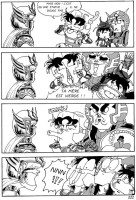 Mon avis : Je n'ai pas lu énormément de Doujinshi je dois le reconnaître, mais parmi tous ceux que j'ai pu avoir entre les mains, il est de loin mon préferé, l'auteur a su exploiter remarquablement les personnages de Kimengumi pour les transposer dans le monde de Saint Seiya. Il n'est même pas nécessaire d'être fan ou de connaître les Joyeux Loufoques et leurs amis pour apprécier cette parodie. Un must que je recommande à tous les Fans de Saint Seiya qui aiment rigoler ^_^ |